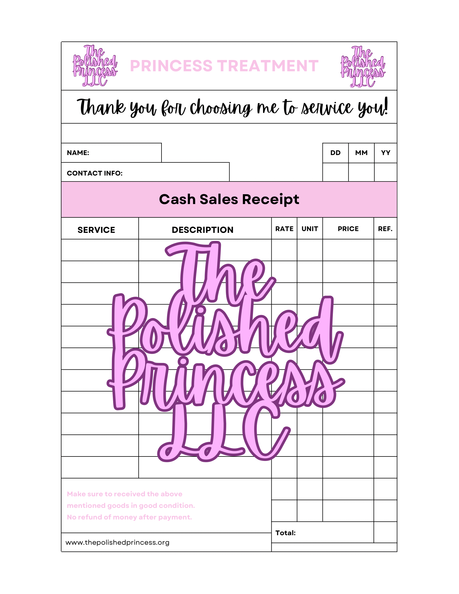 Once purchased, the receipt template will NOT have "The Polished Princess LLC" on it.